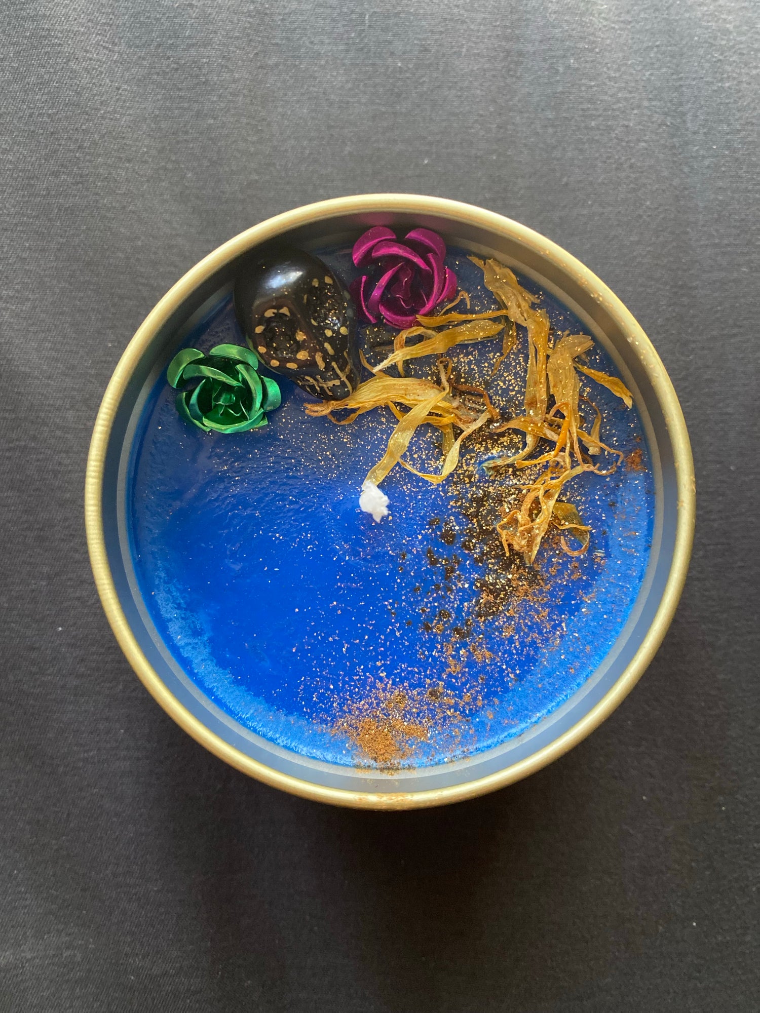 Chocolate and cinnamon scented candle with dried marigold, cinnamon, and a jasper skull
