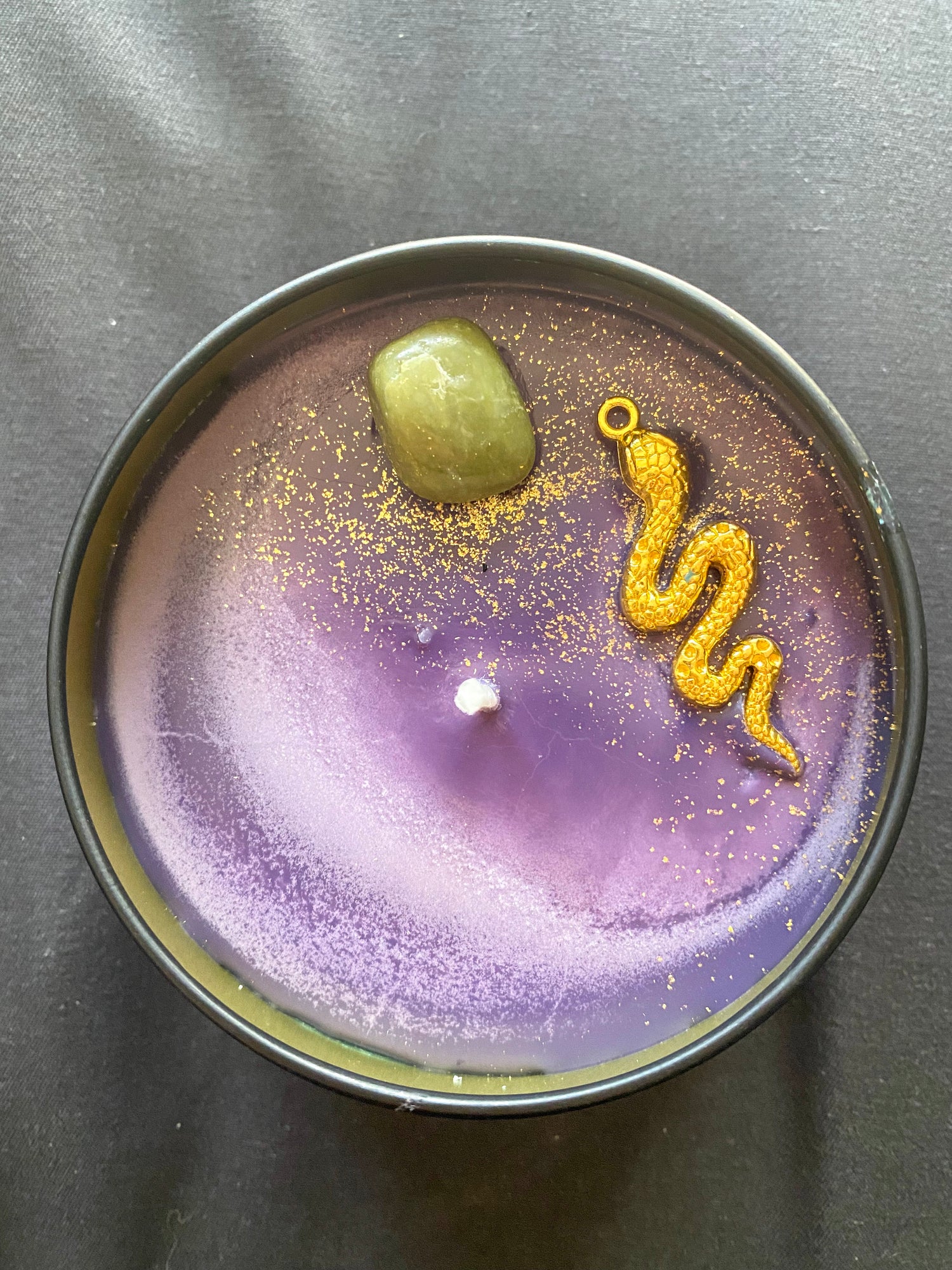 2 layer soy candle with tumbled serpentine and gold snake charm. Smells like: Vetiver, dragons blood, gardenia, and sandalwood